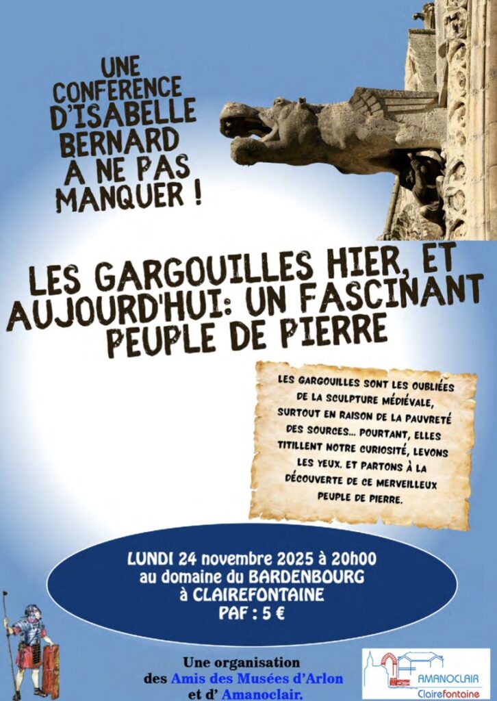 Les gargouilles hier et aujourd’hui : un fascinant peuple de pierre – conférence d’Isabelle Bernard le lundi 24 novembre à 20 h Une conférence d’Isabelle Bernard à ne pas manquer Lundi 24 novembre 2025 à 20h au domaine du Bardenbourg à Clairefontaine PAF : 5 € Une organisation des Amis des Musées d’Arlon et d’AMANOCLAIR Partagez cette page !